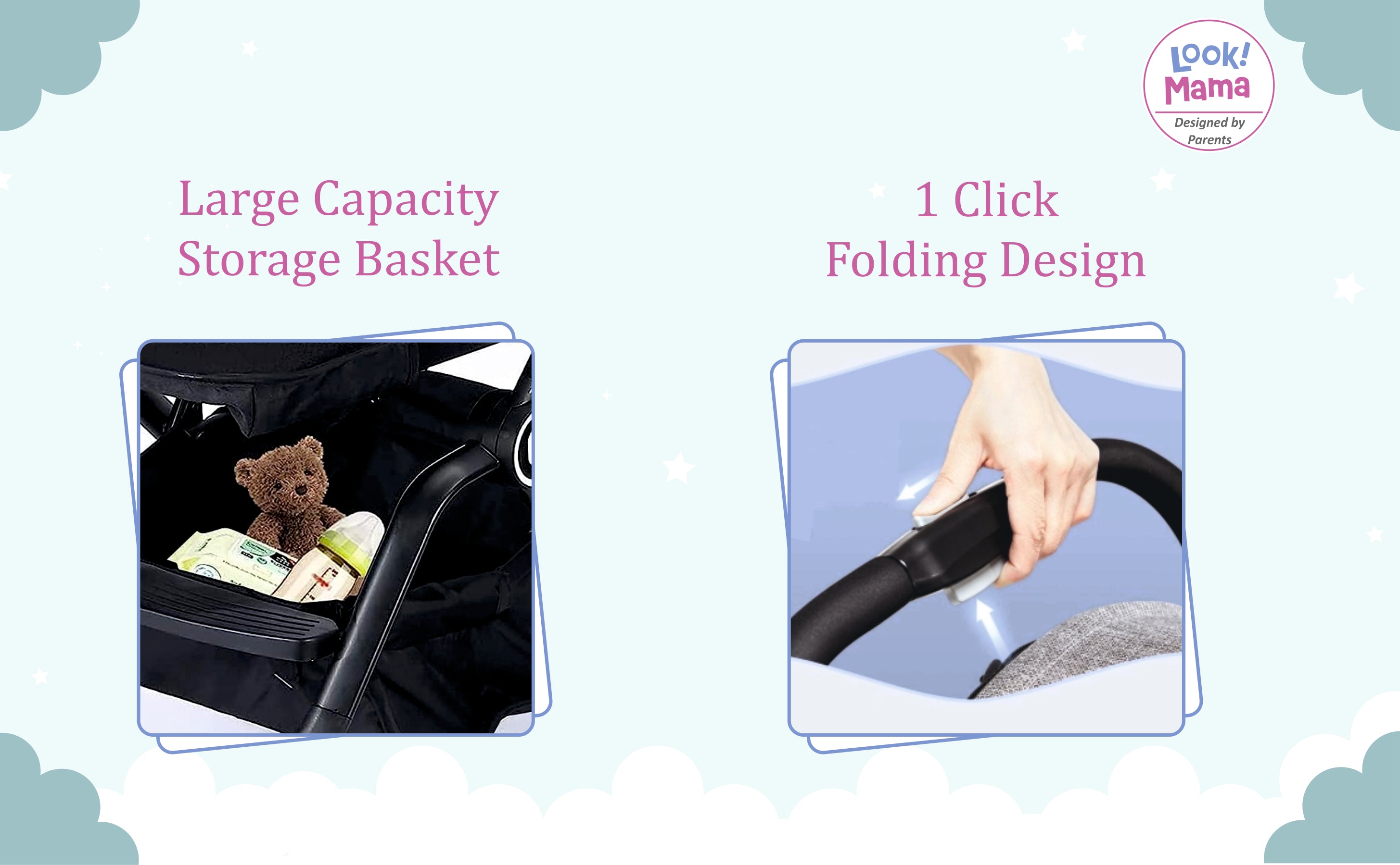 - Ample Storage: Room for Essentials : Don't compromise on storage space when you're on the go. Our foldable travelling pramcomes equipped with a large storage basket, providing plenty of room for all your essentials.